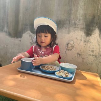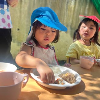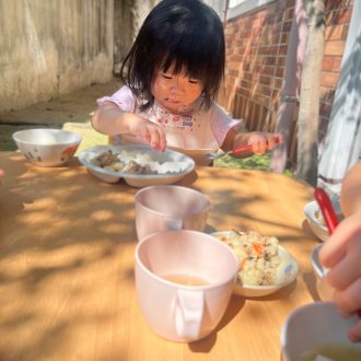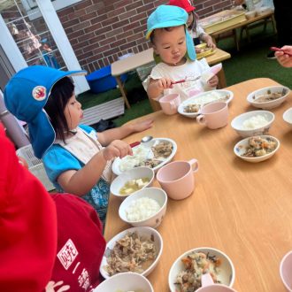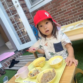 今は給食の時間。何かしらと覗きに行くと・・・。中庭にテーブルがセッティングされて、やどかり、くらげチームさんたちで楽しいランチが始まっていました。この日は、両チームともに欠席者が多く、合同でランチをしていましたよ。