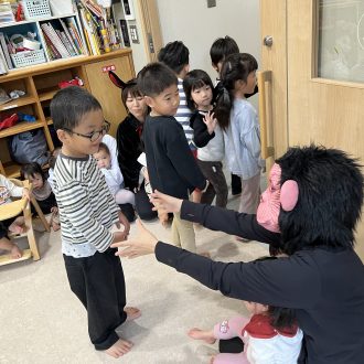 先生たちも仮装しましたよ♪気づくと先生がサルに??ドキドキしながらハイタッチしていました。