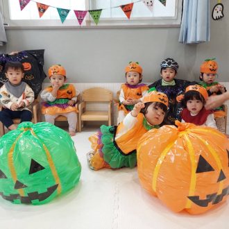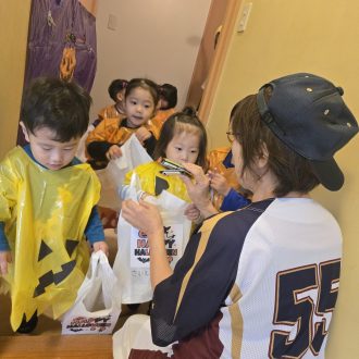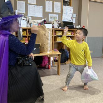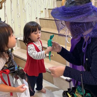 0・1・2歳児は、仮装をして園内を周りました。先生たちからお菓子をもらいほくほく顔です♪
