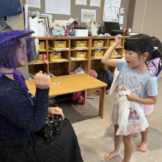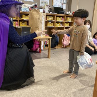 魔女とのジャンケン!勝ち・あいこ・負けでお菓子の数が決まります。これまた、真剣勝負!!中には、後出しする子も?!思わず笑ってしまいました。